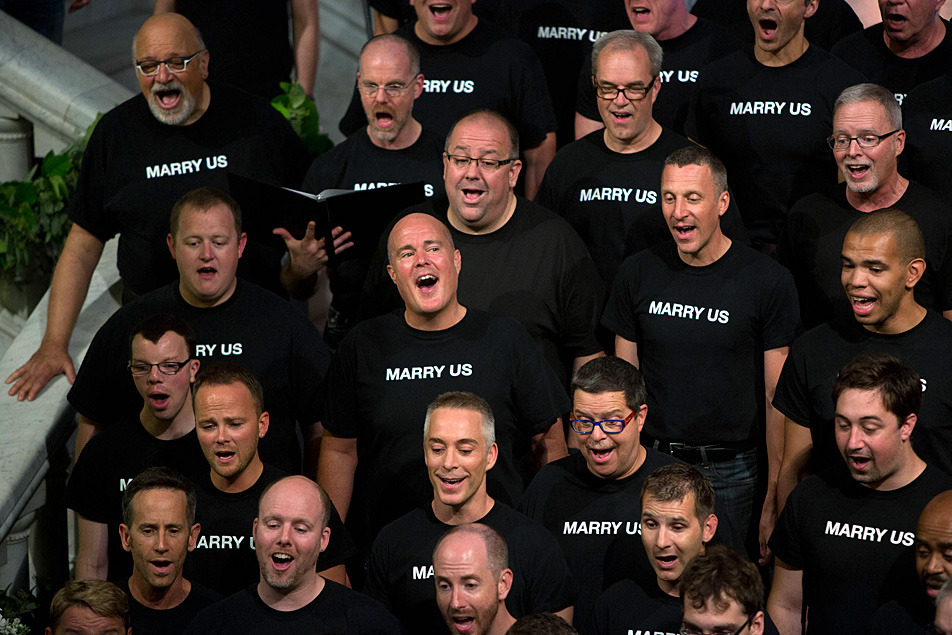 The Twin Cities Gay Men’s Chorus sings at the beginning of the Minneapolis Freedom to Marry Celebration and Weddings just before midnight on Wednesday, July 31, 2013 at Minneapolis City Hall.